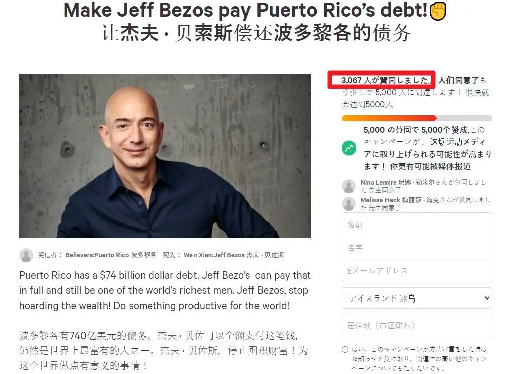 除了请求贝索斯吃掉《蒙娜丽莎》,美国网友为了找贝索斯的乐子,可以说是煞费苦心。比如,还是在change.org上,有化名波多黎各的网友,请愿让贝索斯偿还美国自治邦波多黎各欠下的近740亿美元债务,而理由则是朴素的“因为贝索斯超级有钱,就算付了这钱也还很有钱,所以该着他付”。
