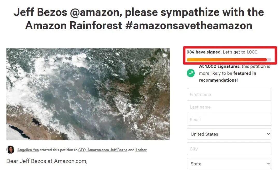 但另一条呼吁贝索斯给遭遇火灾的亚马逊雨林捐款的请愿,却至今都没有达成1000人的目标。