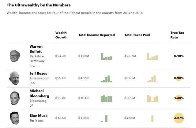 根据新闻组织ProPublica前段时间的报道,包括杰夫·贝索斯在内的众多美国超级富豪,在2014年至2018年间,只缴纳了和真实财富增长对比起来极少的税务,比例要远低于美国普通“打工人”的实际缴税率。