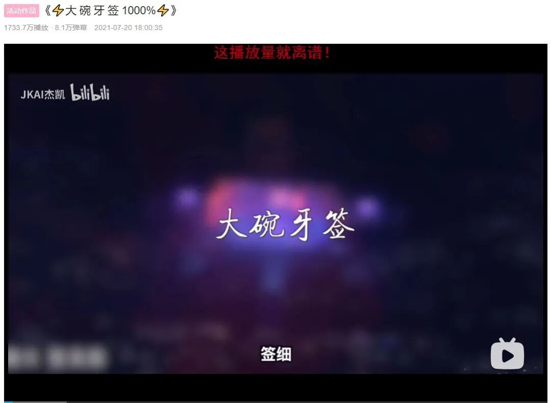 而其中最为登峰造极的二创歌曲,还要数UP主“JKAI杰凯”带来的《大 碗 牙 签 1000%》,播放量达到了惊人的1733万。作为参考,2018年席卷B站的现场版《极乐净土》,至今为止播放量是2296万。而《大 碗 牙 签 1000%》发布于2021年7月20日,仅仅用了不到20天,就已经达到了如今的成绩。