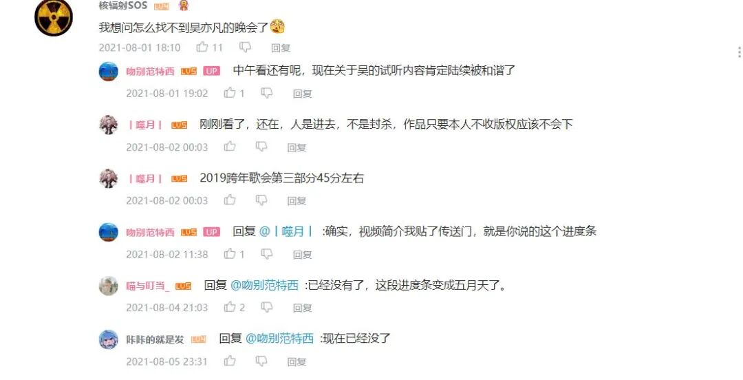 而在许多年前,当吴亦凡凭借一首《大碗宽面》在B站风评逆转的时候,当他登上B站2019年跨年晚会的时候,他可能没有想到,自己会有如此落魄的一天。现如今,有关他的跨年舞台已经被删除。