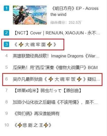 首先引爆舆论话题的是B站音乐区,以“大碗宽面”为主题出现的二创作品,一度占领了音乐区排行榜,时至今日,依然有相关作品榜上有名。