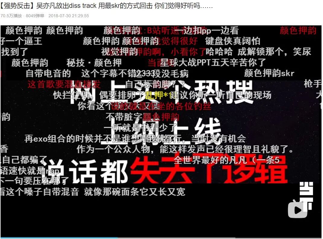 吴亦凡与B站的恩怨,可以追溯到2018年。2017年,随着《中国新说唱》的走红,吴亦凡伴随着一句“你有freestyle吗?”,俨然成了中国说唱圈的代言人。到了2018年,在《中国新说唱》第二季,吴亦凡又带来了新的流行词“Skr”。然而吴亦凡在节目中的表现,引发了不少网友的不满,不少地下说唱歌手以及爱好者,以虎扑为中心,与吴亦凡发生了激烈的论战。