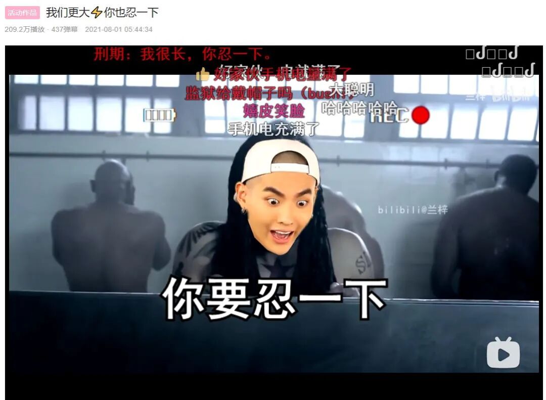 除了杀疯了的音乐区,鬼畜区也没有放过吴亦凡。UP主“兰梓”带来的鬼畜作品《我们更大,也忍一下》,时长只有14秒,台词只有一句“我的很大,你要忍一下”,内容是鬼畜区常见的“兄贵”题材,获得了209万的播放量。