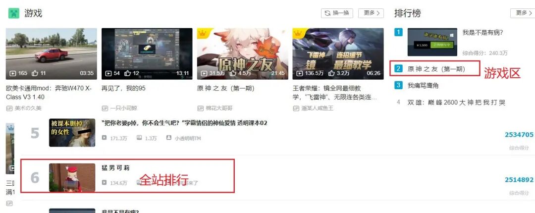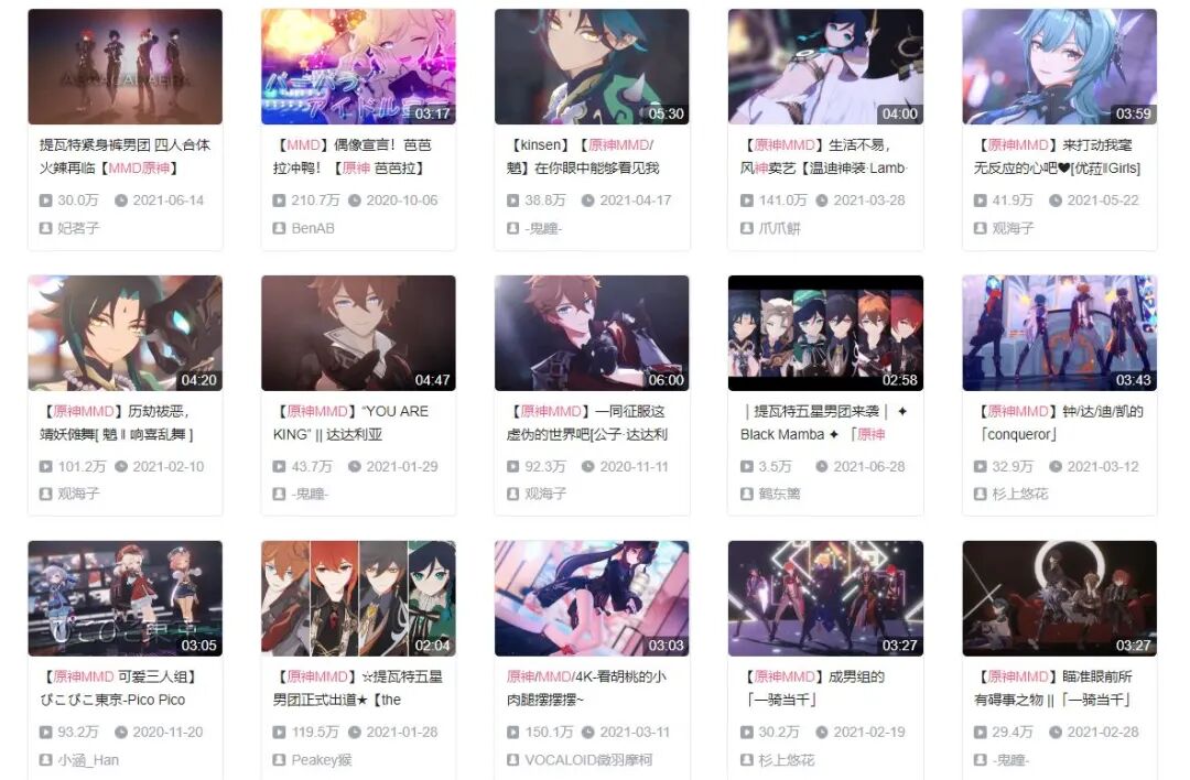 对此最为直观地表现,就是《原神》二创衍生作品的爆发。在国内二次元氛围最浓郁的B站,《原神》衍生视频成为排行榜的常客,经常出现在游戏、动画、生活、鬼畜等板块前列,播放量动辄百万计。