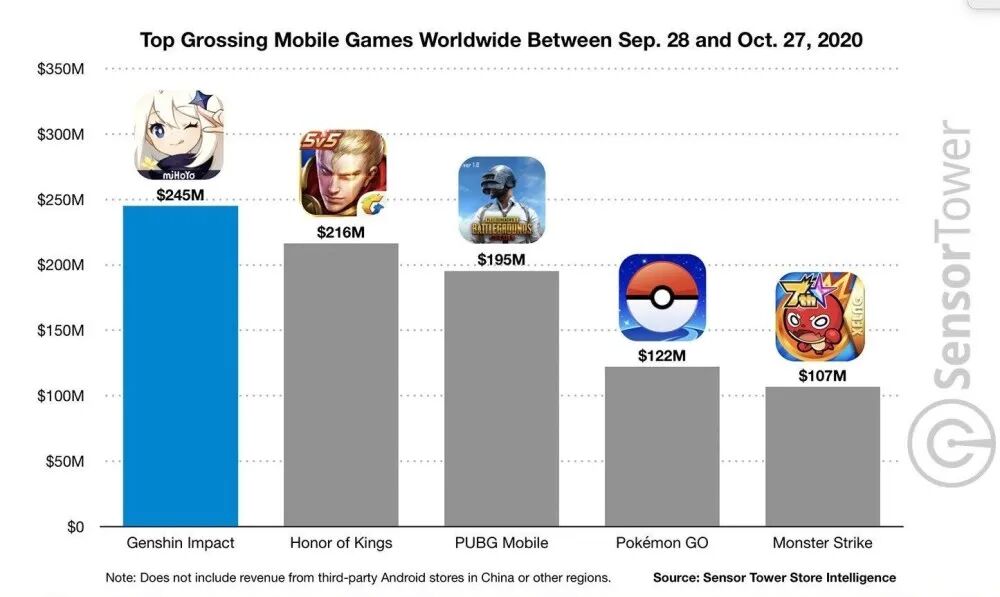 2020年9月,《原神》上市,首月流水一举冲破2.45亿美元(不含PC和国内安卓平台),力压同期的《王者荣耀》,成为2020年手游圈最大的黑马。