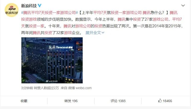 7月5日,“腾讯平均7天投资一家游戏公司”登上了热搜。过去的半年时间里,腾讯平均每七天就会投资一家游戏公司,仅半年时间就投资了27家。