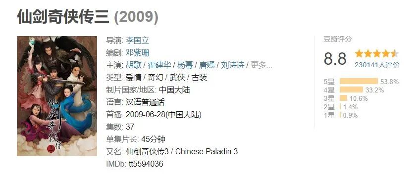 四年之后,《仙剑奇侠传三》电视剧开播,胡歌依然是剧中的男一号,霍建华、杨幂、唐嫣、刘诗诗等青年演员倾力加盟,仙侠剧的热潮卷土重来。《仙剑奇侠传三》豆瓣评分也高达8.8,远超同类题材作品。