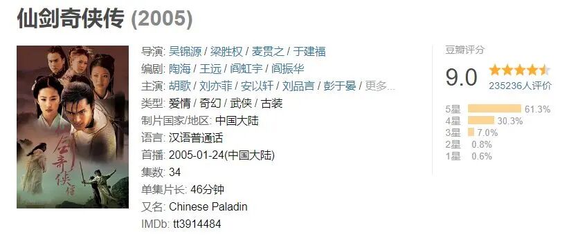 和其他游戏IP相比,“仙剑”的特殊之处在于,不仅创造了中国仙侠游戏的巅峰,而且开创了中国仙侠剧的巅峰。2005年,《仙剑奇侠传》电视剧开播。时至今日,这部剧的豆瓣评分已经高达9.0,评分人数超23万,是豆瓣评分最高的仙侠剧。当然,这也是中国仙侠剧的开山之作。