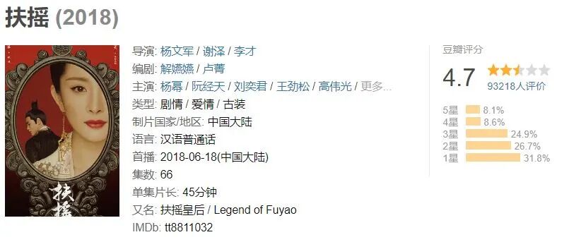 2018年,继《三生三世十里桃花》之后,杨幂带来了《扶摇》。然而,这部剧在豆瓣只得到了4.7分,略显尴尬。实际上,从《三生三世十里桃花》开始,涉嫌抄袭的负面舆论一直没有停止。有网友指出《三生三世十里桃花》原著小说涉嫌抄袭《桃花债》,而《扶摇》电视剧则涉嫌抄袭《哈利波特与火焰杯》。