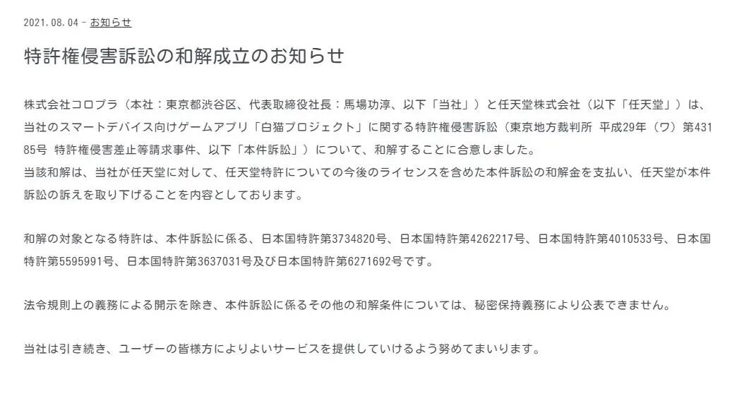 也许光是听到上面这些信息,你已经猜到了今天我想要说的是什么事情,2021年8月4日,株式会社colopl与任天堂株式会社同时宣布,以colopl支付33亿日元和解金的形式,就“特许权侵害诉讼案”达成和解。