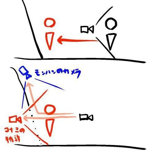 网上的视角说明图,蓝色的为《怪物猎人》视角,红色的为科乐美的“墙壁摄像机”视角
