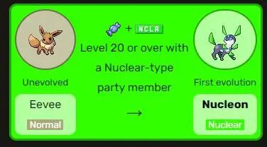 不过,除了稍微有点特殊的世界观外,“铀”仍旧遵守着“宝可梦”系列中,玩家最重视的部分。比如,当玩家身上同时携带着“辐射宝可梦”与伊布时,伊布便会在进化的时候受到辐射的影响,进化成为自带“核”属性的“核伊布”。