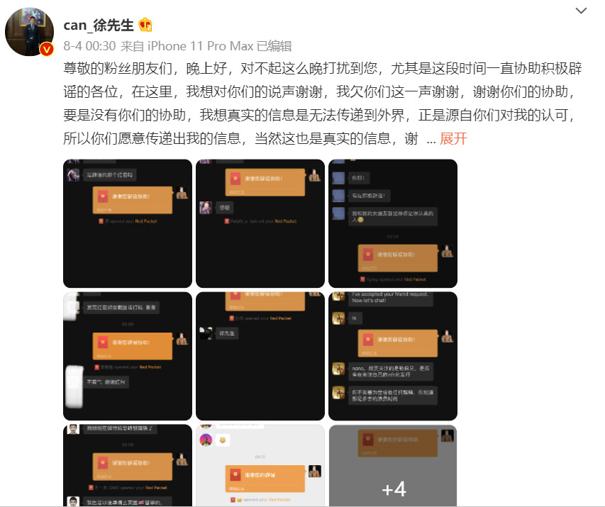 对于这些质疑,徐先生目前只是一律以“谣言”为回复。同时,他也在微博晒出了多张聊天红包截图,希望有更多粉丝能向他反映“谣言”的来源,他将给予一定的金钱奖励,感谢这些愿意“帮助”他的粉丝们。