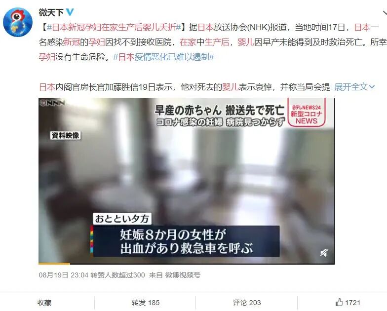 日本因新冠疫情引发的悲剧不止一例。17日,一名感染新冠病毒的孕妇找不到可以引产的医院,只能在家里生产,但不幸的是,婴儿因早产死亡。
