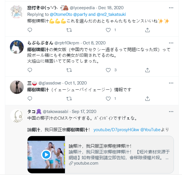 在推特上,椰树牌椰汁也带有一定的流量。像是之前那几个广告案,都引起了部分日本网友的讨论。