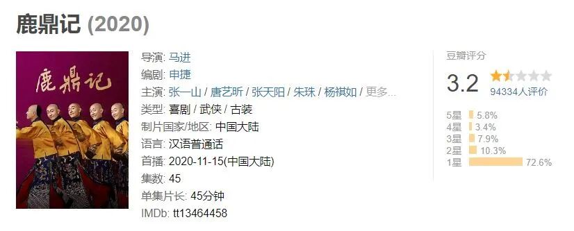 张一山版《鹿鼎记》豆瓣评分更低,目前只有3.2分,杨祐宁版《天龙八部》与之相比,还高了0.4分。但这并不是一件值得骄傲的事情。评分之外,张一山版《鹿鼎记》评价人数9.4万,而杨祐宁版《天龙八部》目前只有2.8万,相形见绌。