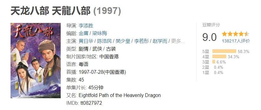97版《天龙八部》是所有剧版中,豆瓣评分最高的一部,达到了9.0分。这一版集结了黄日华、陈浩民、樊少皇、李若彤等实力派演员,其中黄日华已经饰演过83版《射雕英雄传》中的郭靖,李若彤则饰演过95版《神雕侠侣》中的小龙女。