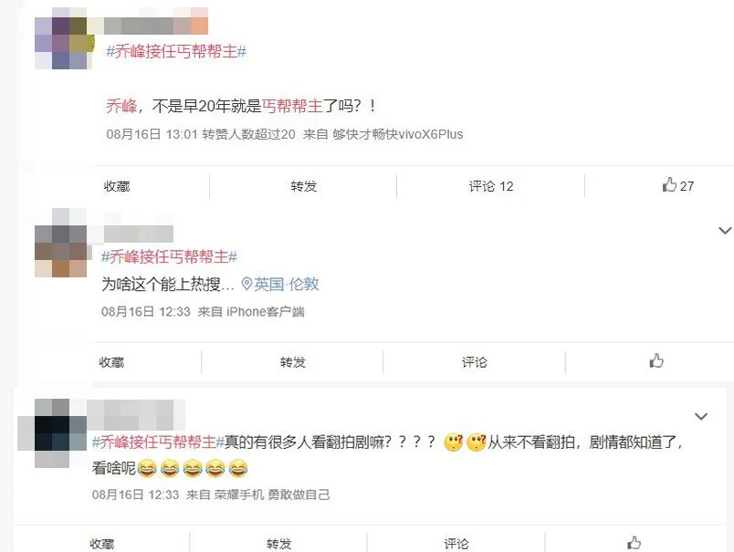 但网友们讨论的重点,却并不是这部电视剧本身。有人直言,乔峰不是20年前就当上丐帮帮主了吗?也有人吐槽,为什么这也能上热搜?更有人说,自己从来不看翻拍剧,因为剧情都知道了。