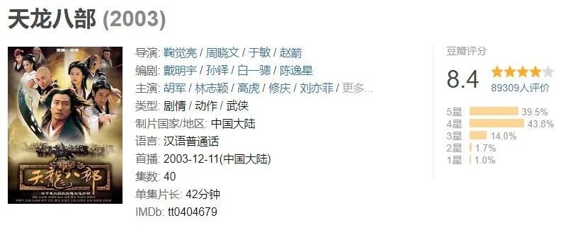 97版《天龙八部》之后,另一部广受好评的翻拍版本,就要数大胡子张纪中的03版《天龙八部》。岁月的摩挲之下,豆瓣评分会抹平很多疤痕。03版《天龙八部》开播之初,所面临的舆论环境并不比今天的杨祐宁版《天龙八部》好多少,如果非要说好在哪的话,之前的珠玉只有97版《天龙八部》一部,但这一部,却是最为经典的一部。