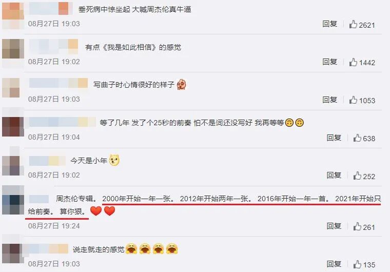对于周杰伦的歌迷而言,即便仅仅是25秒的前奏,也已经如同过年一样幸福。当然,也有人对此大倒苦水:“2000年开始一年一张, 2012年开始两年一张,2016年开始一年一首,2021年开始只给前奏。”遥想当年,2003年周杰伦在新歌《梯田》里,曾经向方文山大倒苦水:“文山啊,等你写完词,我都出下一张专辑喽。没关系,慢慢来,这首歌我自己来。”那时候,周杰伦出新歌的频率,令人恍如隔世。