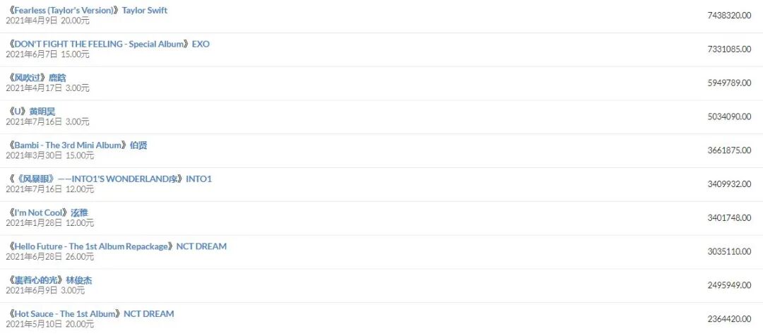 进入到2021年,目前专辑销量前十的歌手,大多来自偶像团体、演员,包括刚刚被封杀的张哲瀚,原创歌手毛不易在其中显得格格不入。至于这些偶像的专辑销量为什么高,大家心里应该都有数。
