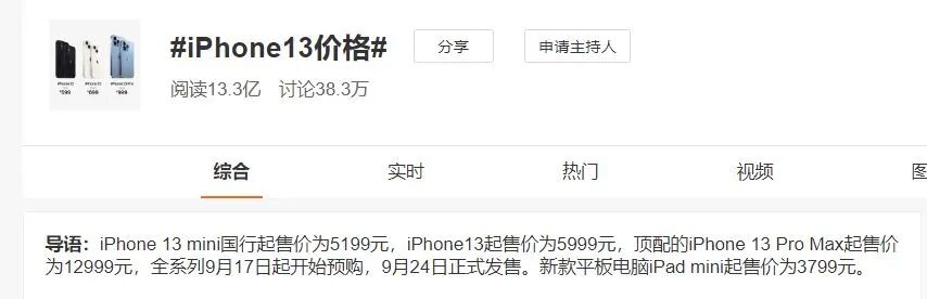 9月15日,随着苹果2021秋季新品发布会落下帷幕,果粉们翘首以盼的iPhone 13,终于露出了庐山真面目。仅仅在新浪微博,有关iPhone 13的热搜就多达数条,“iPhone13价格”这一话题,更是达到了13.3亿阅读,38.3万讨论。作为顶配的iPhone 13 Pro Max,售价达到了12999元——对于苹果手机而言,这不算“贵”。