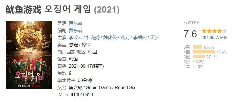 不过在豆瓣,《鱿鱼游戏》的评价相对而言冷静了不少,评分维持在了7.6的水准,不上不下。即便如此,在我看来,7.6的评分仍然有些虚高。