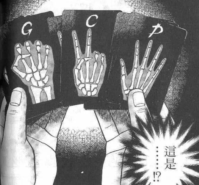 同样是取材自现实世界的游戏,《赌博默示录》的“石头,剪刀,布”,设定了更具变数的游戏规则,选手的启动资金为三颗星星,以及石头、剪刀、布各四张牌。在规定的时间内,与其他选手对局,最终保持三颗星星,且用完所有手牌的人才能赢。整个博弈过程中,充满了算计与人性。