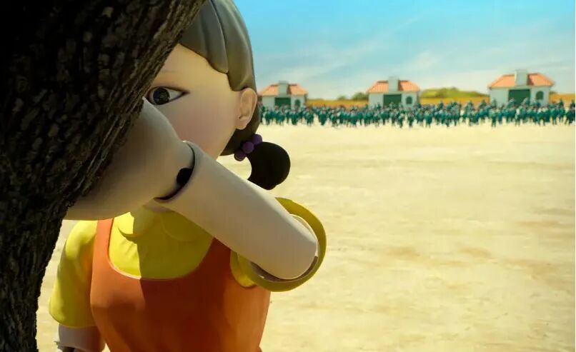 而执行审判的方式,就是通过这个身穿橘红色连衣裙、憨态可掬的女童玩偶——眼睛里的扫描装置,选手一旦被侦测到身体出现位移,就会被远处的枪手射杀。在这里,玩偶的意象与小丑异曲同工。