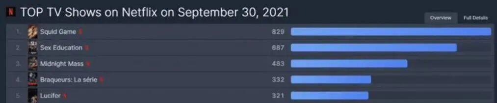 诚然,《鱿鱼游戏》已经毫无疑问地成为今年全球热度最高的剧集之一,自其9月17日上线以来,先后在190多个国家和地区登顶剧集热度榜,其烂番茄新鲜度超93%,在网飞自家同期剧集中更是一骑绝尘,甚至获得了网飞联合CEO泰德·萨兰多斯“有可能成为网飞史上最受欢迎剧集”的高度评价。
