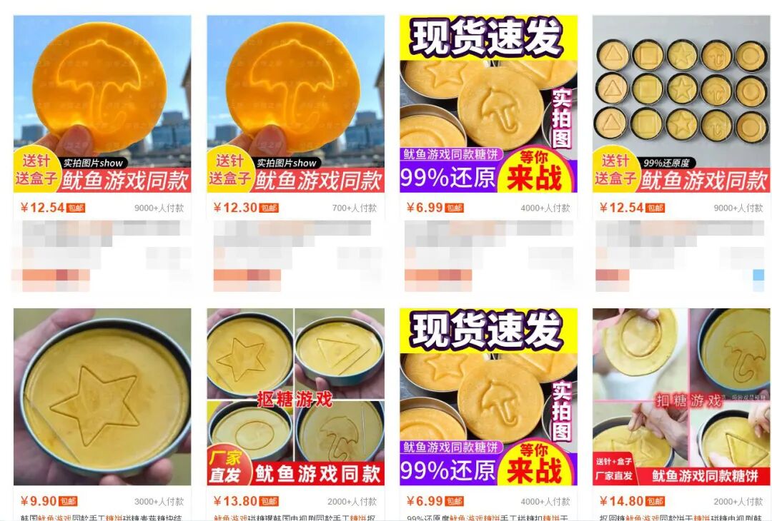 不仅如此,《鱿鱼游戏》在周边商品销售上取得的巨大成功,同样不容忽视。尤其是在中国市场,即便这部剧没有得到引进,但依然带火了众多周边商品的销量,比如剧中标志性的椪糖。这些打着《鱿鱼游戏》旗号的商品,显然是没有获得官方授权的,但依然可以在市场上流通。在利益的纠缠下,销售这些小商品的商家,客观上成为抬高《鱿鱼游戏》热度的帮手。至于因此产生的二度创作,就更是数之不尽了。这也就能解释,为何优酷会做出碰瓷《鱿鱼游戏》的掉价行为了。