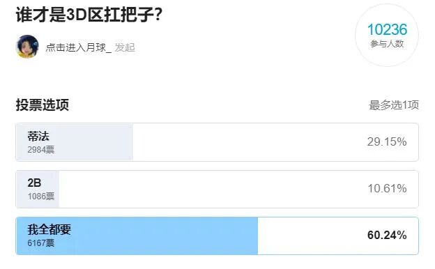 这样优秀的建模,3D区又怎么能够放过?B站UP主“点击进入月球_”就曾发起蒂法和2B“谁才是3D区扛把子”的投票,虽然2B不敌蒂法,但选择“我全都要”的人,具备压倒性的优势。