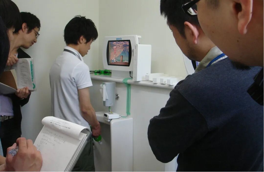 这个奇怪的装置前面,一名世嘉男性社员,正在为可能合作的客户,介绍着产品的详细信息,顺便接受各家媒体的采访。他就是来自世嘉第一研究开发本部(AM1)的制作人町田裕孝,为了将这台号称可以用“尿”来玩的游戏机推向市场,他和整个开发部门已经忙了不知道多少年了。现在,他终于可以正式向所有人介绍这款名叫《厕所(TOILETS)》的街机框体了。