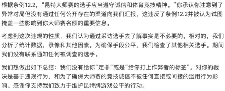 他们对球哥提出来的不合理之处草草带过,没有给出正面且有力的回应。对于3.7%这个古怪的比例是如何计算出来的,以及那些故意给球哥投降的作弊者究竟是谁,均未明说。如果真的有人刻意破坏竞技公平,那么被处罚的不应只有球哥一人。