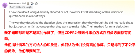 而球哥本人,也同样对这个结果,难以接受。故而在11月15日,球哥向CDPR发起了申诉。在超过24小时没有得到CDPR的回应后,他将申诉的内容以公开信的形式,同时发布在了Reddit和旅法师营地等中文社区上。