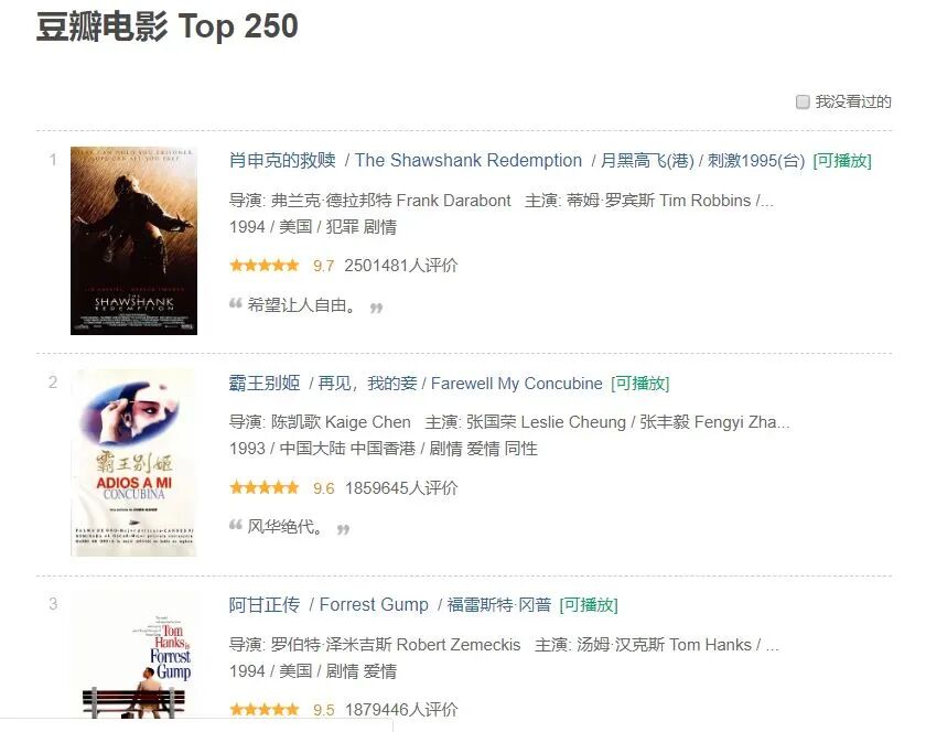 但文艺的圈子,还是太小了。豆瓣最引以为傲的,乃至最为大众所熟知的,毫无疑问是它的电影评分体系。打开豆瓣电影Top 250,名单上一连串的高分电影,基本代表了这个时代电影产业的精华。《肖申克的救赎》排名第一,《霸王别姬》排名第二。