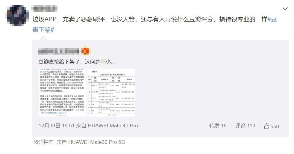 12月9日,工业和信息化部信息通信管理局发布公告,因未能按照要求完成整改,包括豆瓣在内的106款APP,进行了下架处理。公开的信息显示,豆瓣被下架的原因是“超范围收集个人信息”。现在,各大手机应用商店中,已经搜寻不到豆瓣的身影。