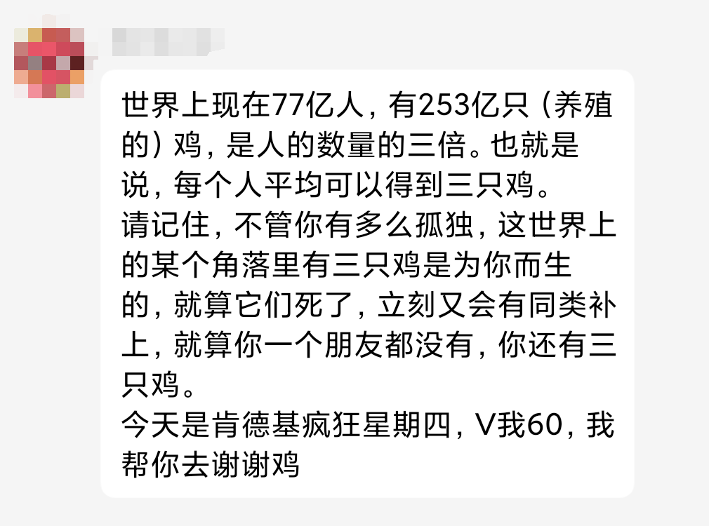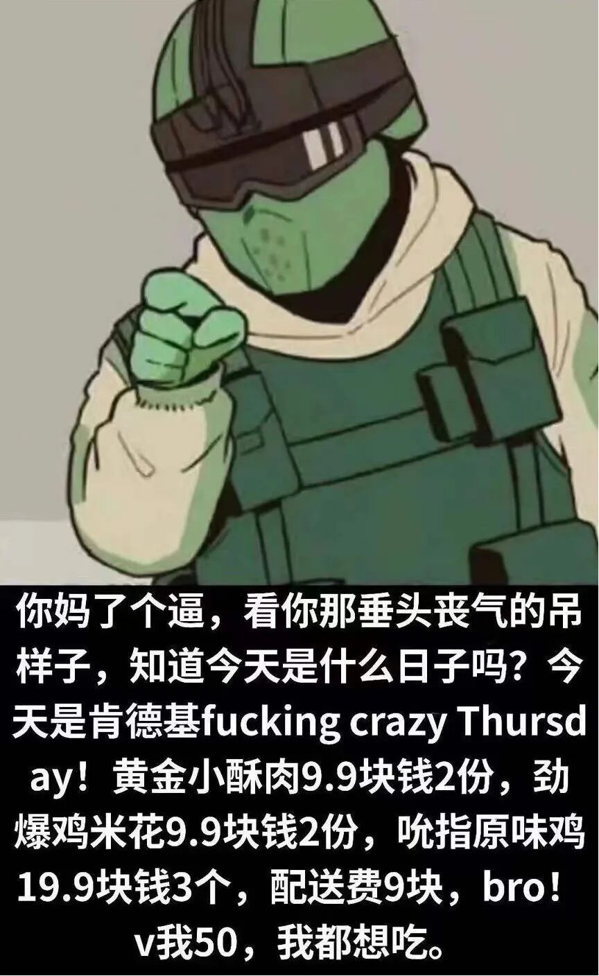 早上起来,你打开群聊,想要看看群聊中的沙雕网友半夜又说了啥,却会发现不断走到哪里,总会有一段奇怪的文案紧随其后。这些文案千变万化,但你深知网友的狡猾,直接看向最后,不出意外,你看到了“疯狂星期四”那熟悉的字样。
