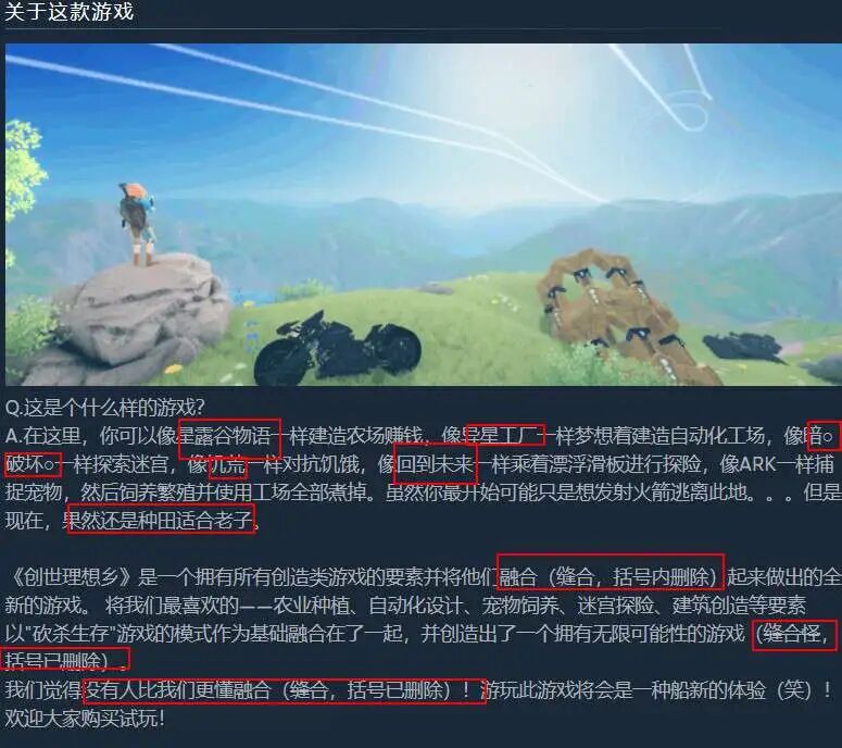 《创世理想乡》最初之所以能够获得广泛关注,就是在于其展现出的,极其夸张的缝合能力。就连游戏开发者本身,也在游戏的简介以及内容介绍里,用大量玩梗的文字,展现了本作“缝合怪”的本质。