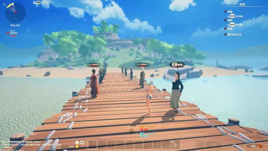 随后,玩家就被传送到了一片海岛上。首先出现在眼前的,是一条长长的栈桥,栈桥的左右两侧,分别站着一列纹丝不动的女性NPC,她们每个头顶都显示着各自的名字——教程女1、2、3、4。与她们互动,她们身旁又会冒出一条条文字教程,指引玩家基础的操作技巧。