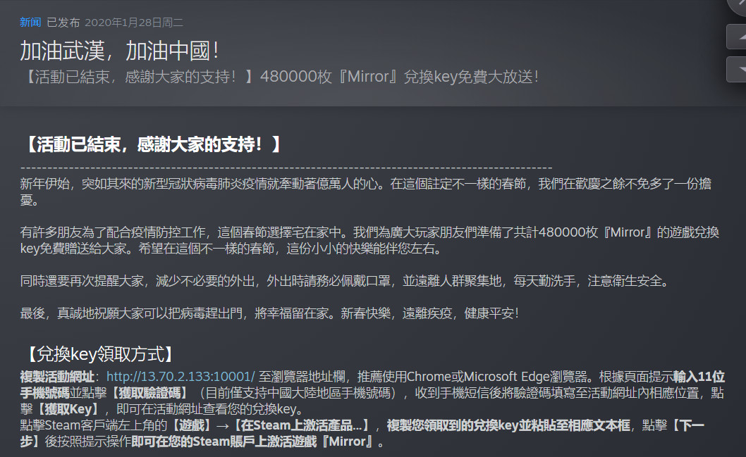 对于中国玩家而言,《Mirror》还有着一层特殊的意义。在2020年年初,国内新冠疫情最为紧张的时期,《Mirror》的开发商,推出了支援中国武汉,免费送《Mirror》游戏KEY的活动,最后总计送出48万个免费的游戏KEY,在玩家群体中引发了热烈讨论,帮助不少玩家打发了疫情隔离期间的无聊时光,也让这款原本只有老司机才知道的黄油,真正打开了知名度。