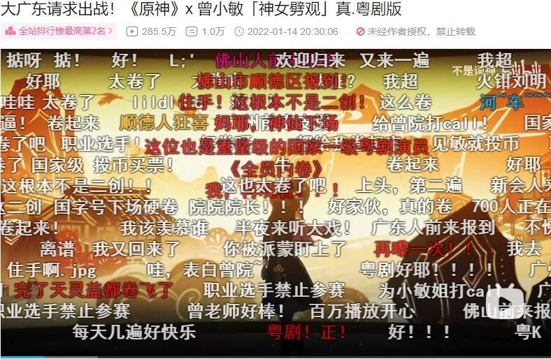 不出意外,《神女劈观》引发了二创的狂潮,众多二创作品如雨后春笋,不断涌现。据不完全统计,仅B站出现的《神女劈观》二创,数量已经接近200个。当然,这还不是最令人意外的,广东粤剧院国家一级演员、广东省第六批省级非物质文化遗产代表性项目(粤剧)代表性传承人曾小敏,同样加入到了二创的队伍中。