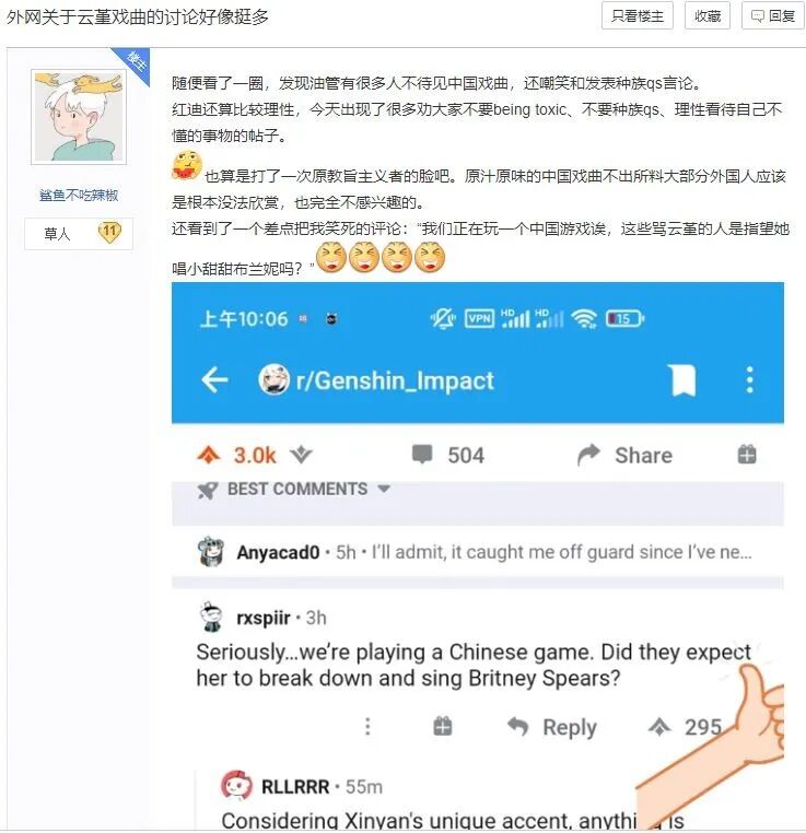 在云堇的戏曲元素曝光后,国外玩家一度因为极具中国文化符号的戏曲唱段,产生了激烈的争论。一部分玩家持开放接纳的态度,善意面对陌生的文化。另一部分玩家则展现出强烈的“文化鄙视”,对中国戏曲恶言相向。更有甚者,针对中国的种族歧视言论开始出现。