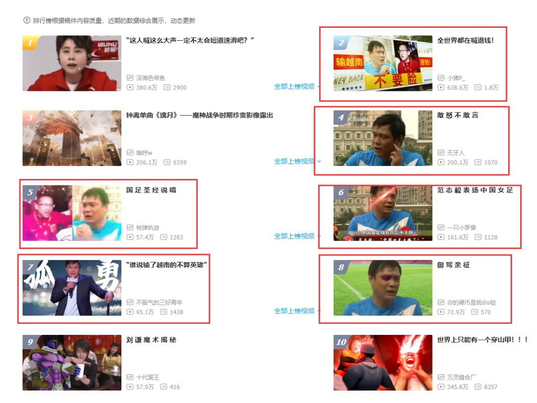 从B站鬼畜区的排行榜就能看出,过年这段时间,范志毅鬼畜视频热度与排名都是居高不下。即便男足输给越南这件事过了一周有余,仍有数个范志毅相关的鬼畜视频,挤进了鬼畜区排行榜前十。在这么一股热潮下,范志毅鬼畜的各种“花活”,也是层出不穷,从形式到内容,都给网友带来了耳目一新的感觉。