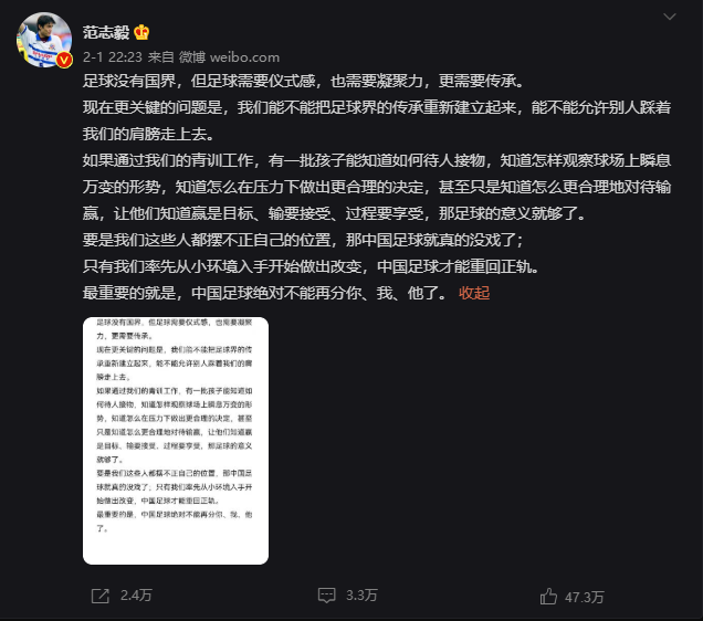 就如同十年前还能直呼男足“脸都不要了”的范志毅,在得知这次男足输给越南后,也只能是发了个微博,为男足今后的发展与改进,提供了一个建设性的方向。