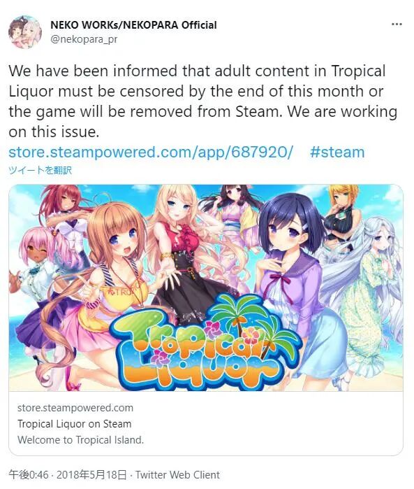 2018年5月,包括《哈尼炮》的开发者“HuniePotDev”、《猫娘乐园》的海外开发商“Neko Works”,以及《黄雷的伽克苏恩》的发行商“MangaGamer”在内的不少成人游戏相关者,都突然收到了来自Valve的邮件警告。而警告的内容,则是要求它们对于已经上线,或者准备上线的游戏内容进行修改,如果不能在限定时间内删除色情内容,Steam将可能直接停止该游戏的售卖。
