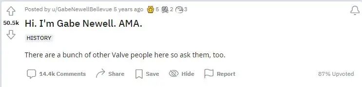 2017年1月,G胖——加布洛根·纽维尔在著名的社交网站Reddit上,以自己ValveCEO的身份,发起了一次“AMA(Ask Me Anything)”活动,同意玩家向他提出任何自己关心的问题,引起了大批Steam用户的围观。