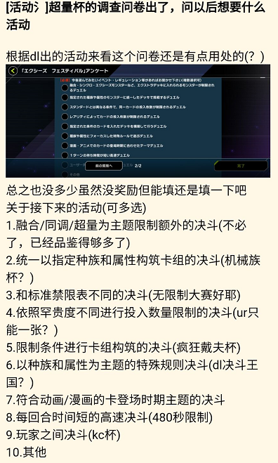 值得一提的是,在“超量杯”临近结束时,Konami依照惯例给所有玩家发了一则调查问卷,咨询玩家对活动的建议,以及后续活动形式的想法。