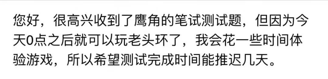 也有找工作的网友在收到鹰角的笔试测试题后,担心测试题影响自己体验《艾尔登法环》,于是诚恳地向对方提交延期申请。短短一句话,对《艾尔登法环》的感情便已跃然纸上。